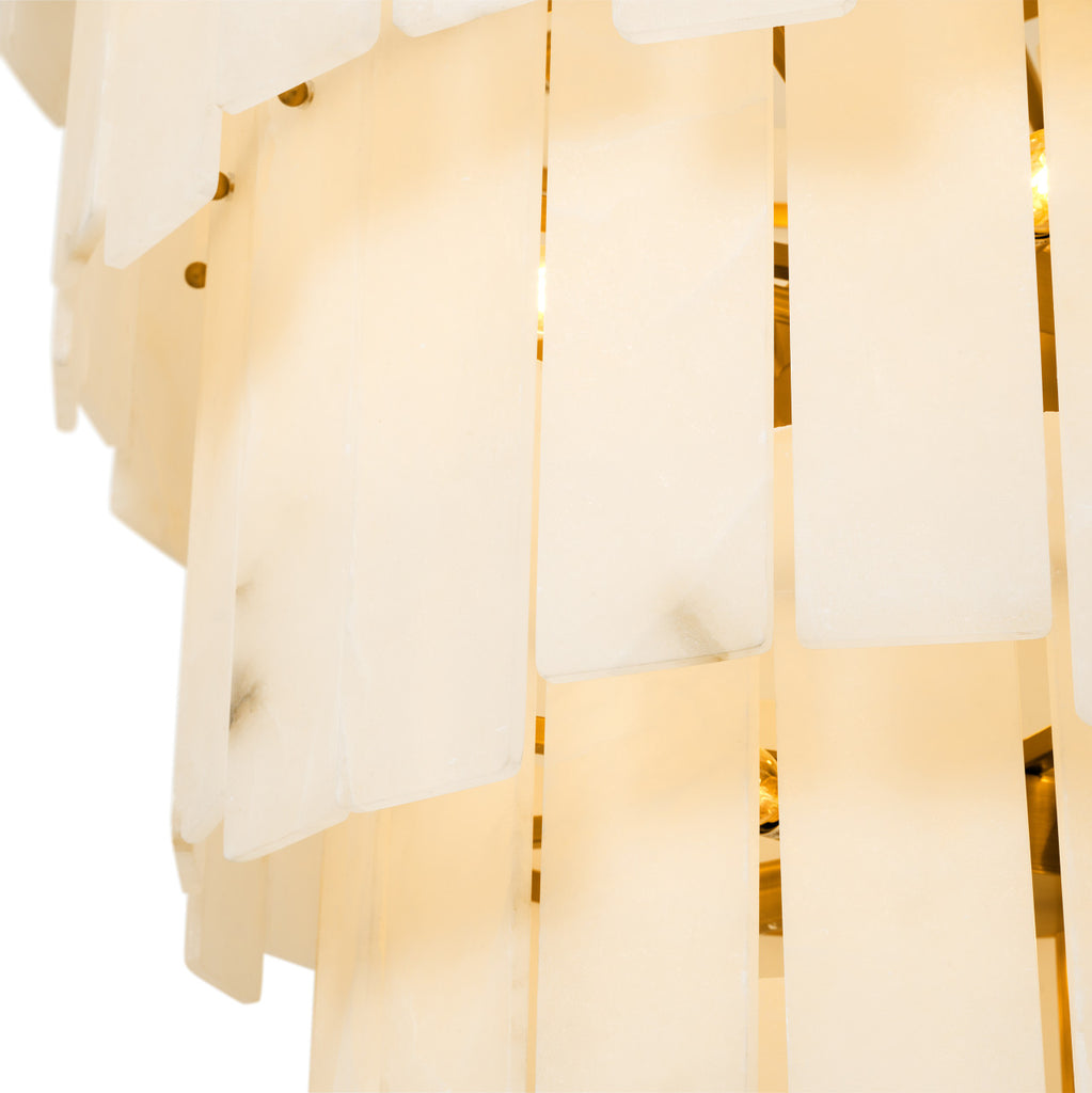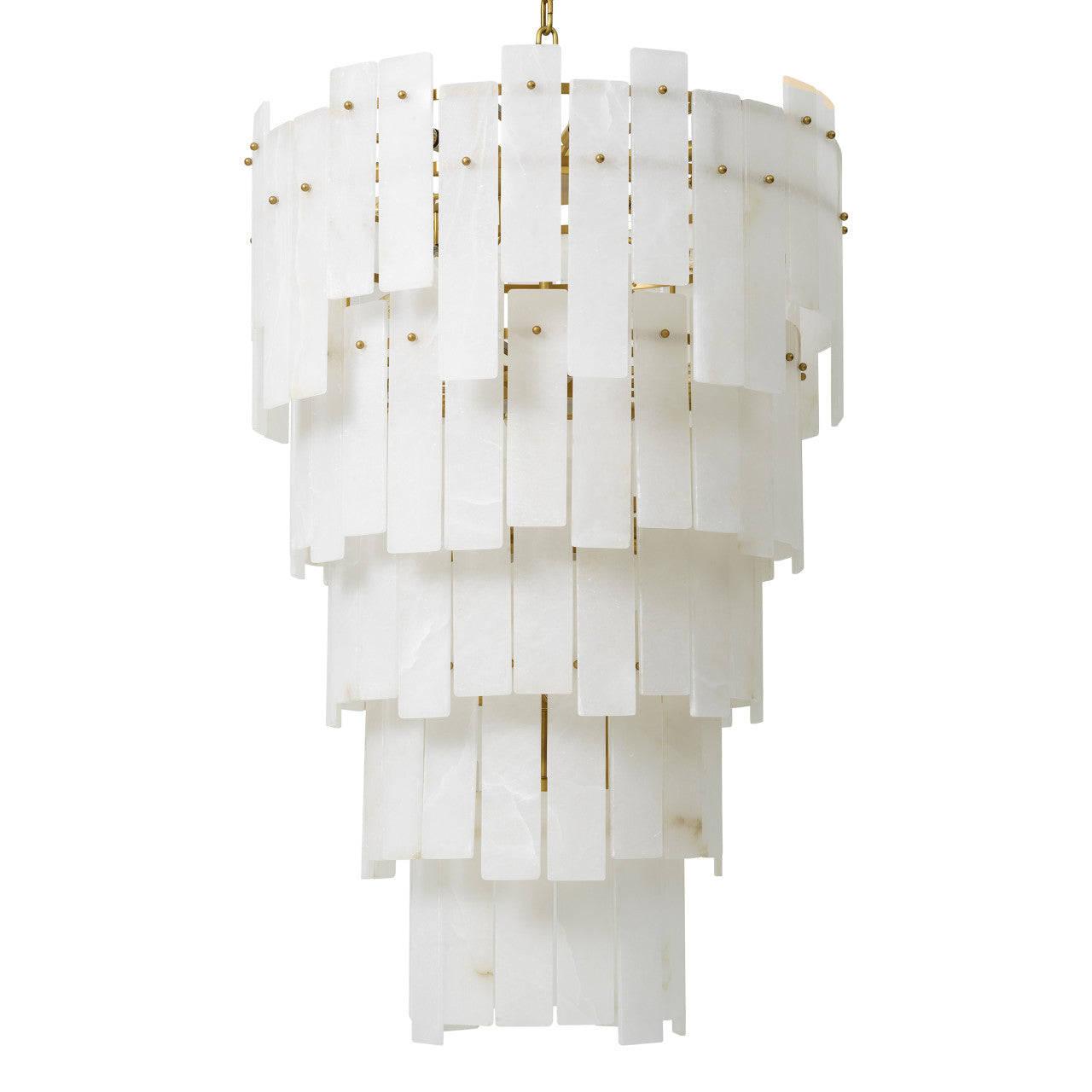 Transformeer je interieur met de Greyson XL Chandelier in antiek messing, voorzien van luminescente albasten kappen die een zachte, uitnodigende gloed verspreiden. Het robuuste frame combineert stevige elegantie met subtiele warmte.