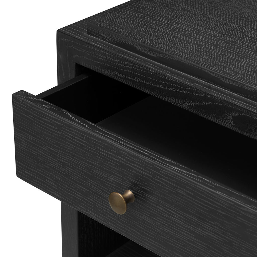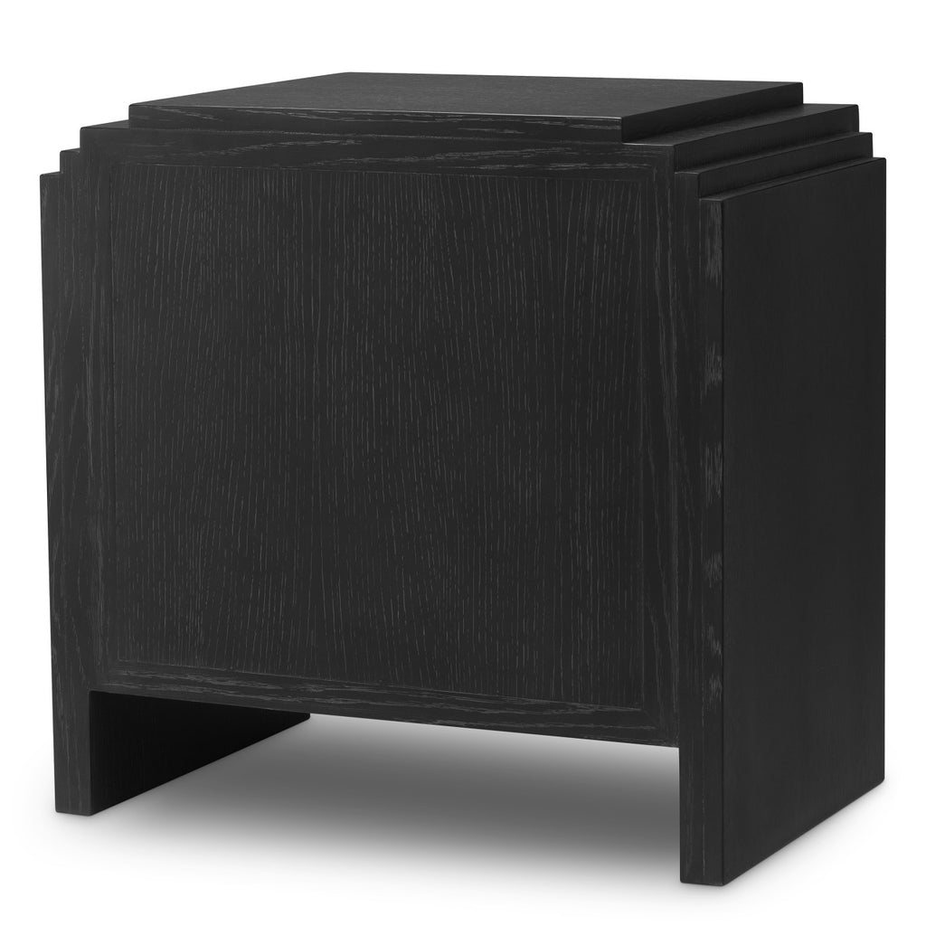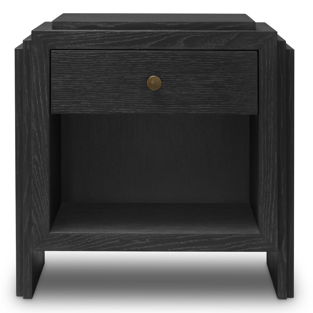Verhoog de uitstraling van je interieur met de Nightstand ArtDeco, uitgevoerd in charcoal grey eikenfineer en gecombineerd met bronzen accenten. Dit verfijnde ontwerp vangt de charme van Art Deco elegantie.
