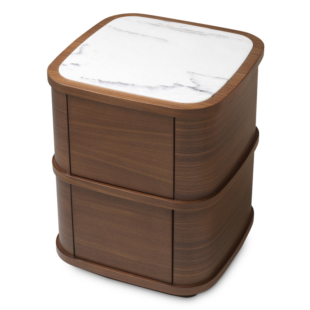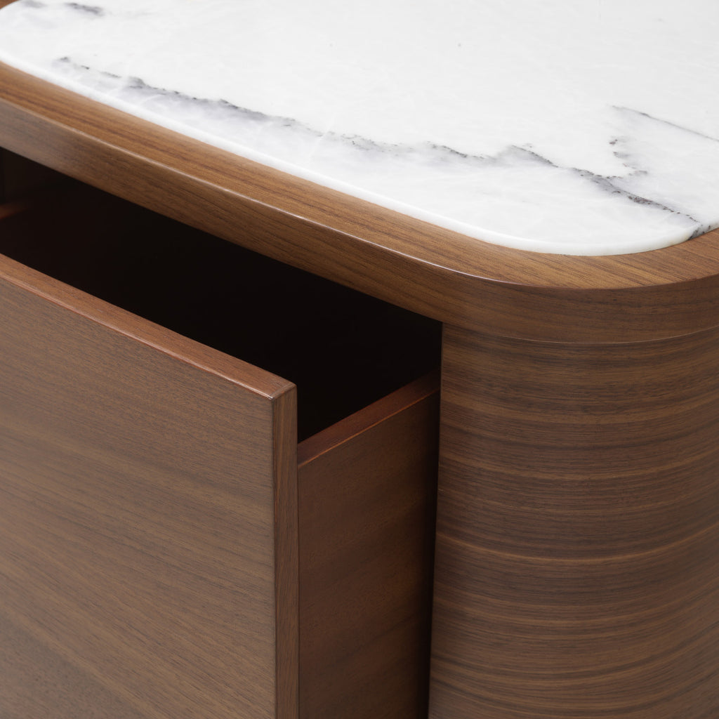 De Nightstand Cabana S heeft een compact silhouet, vervaardigd uit rijk walnotenhoutfineer en afgewerkt met bianco lilac marmer. Deze combinatie van warm hout en koele steen zorgt voor een verfijnde uitstraling.