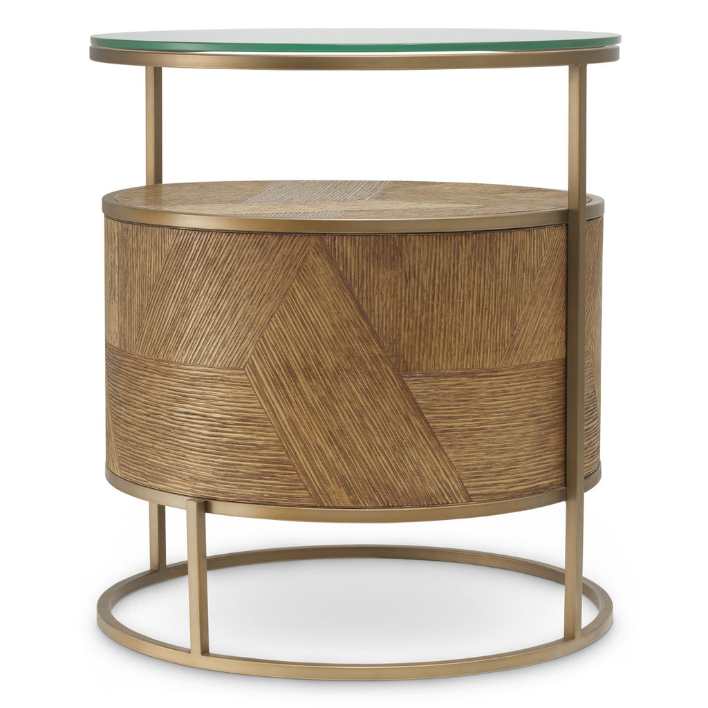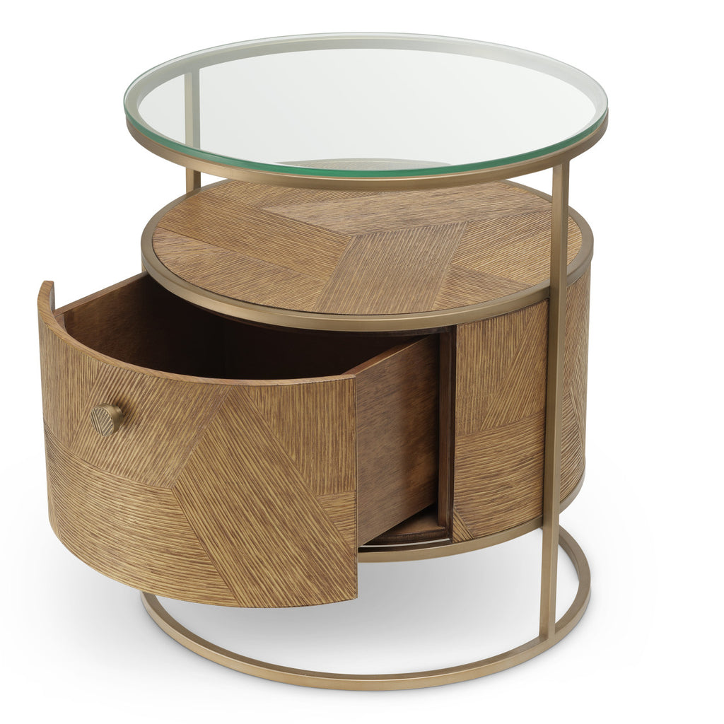 Verhoog de uitstraling van je interieur met de Nightstand Velutto, uitgevoerd in warm karamelkleurig gesneden eikenfineer en gecombineerd met een verfijnde geborstelde messingafwerking. Dit elegante meubelstuk brengt een balans tussen organische textuur en subtiele metallic glans.