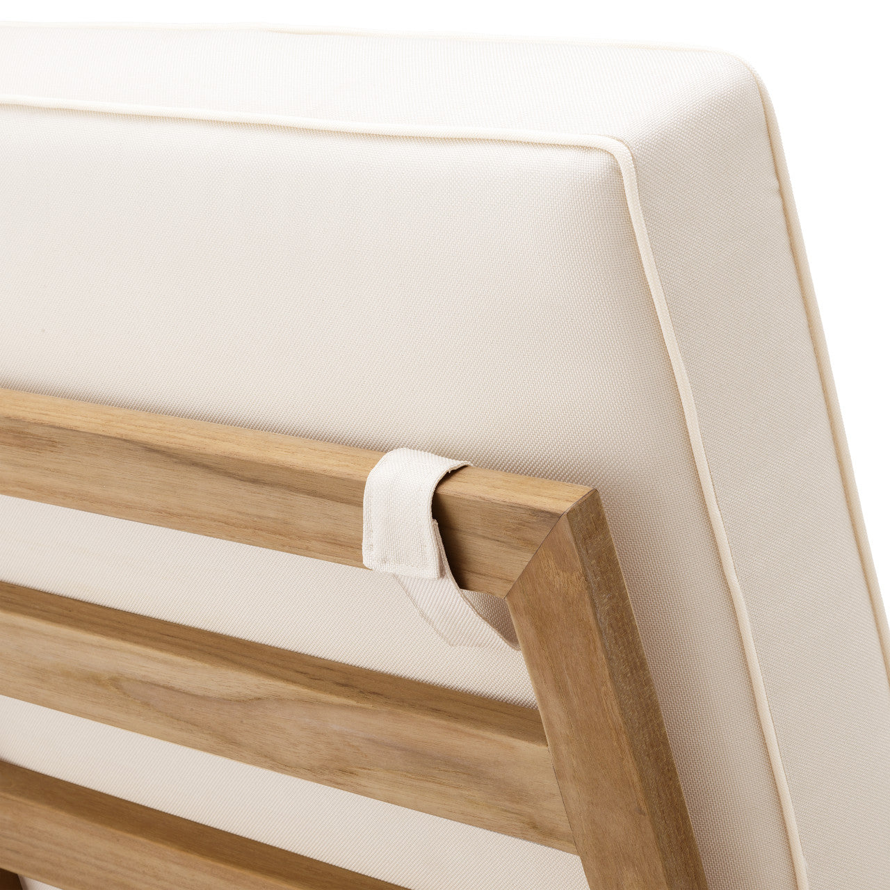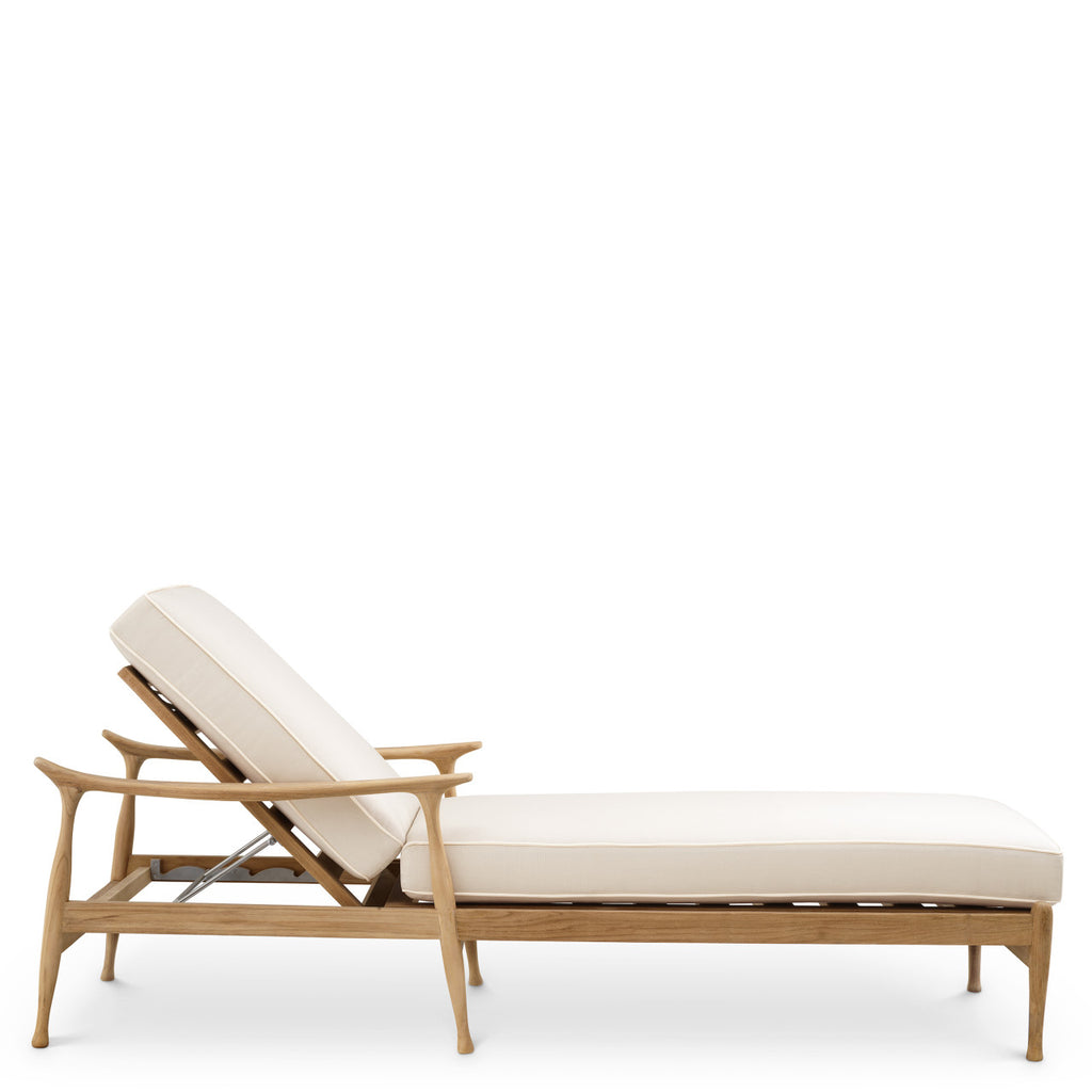 De Outdoor Daybed Manzo in natuurlijk teak combineert robuuste duurzaamheid met serene elegantie. Bekleed met zachte flores off-white kussens nodigt hij uit tot ontspanning met een zacht, tijdloos palet.
