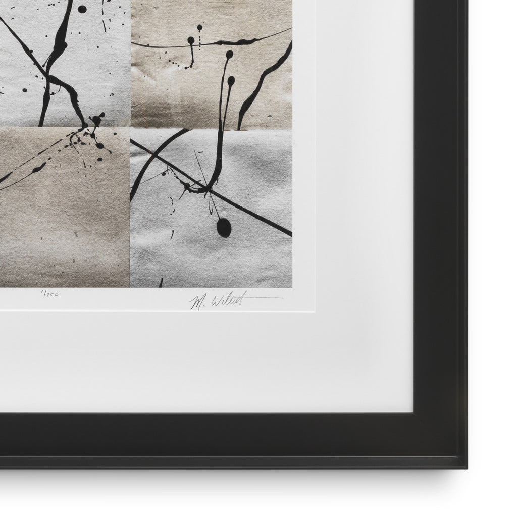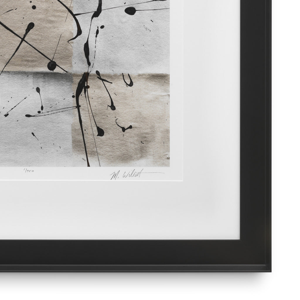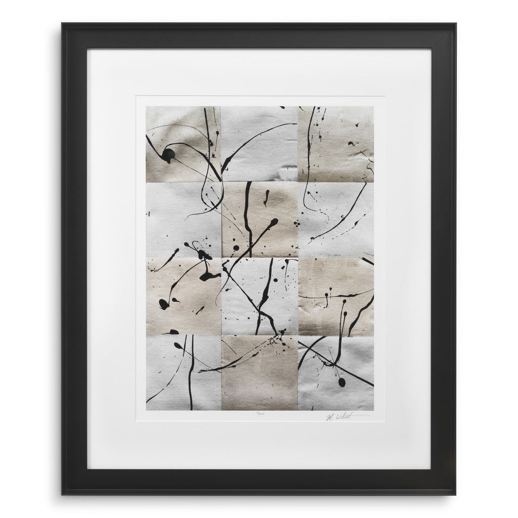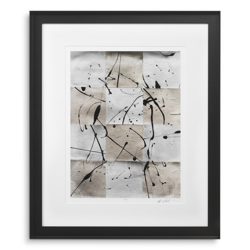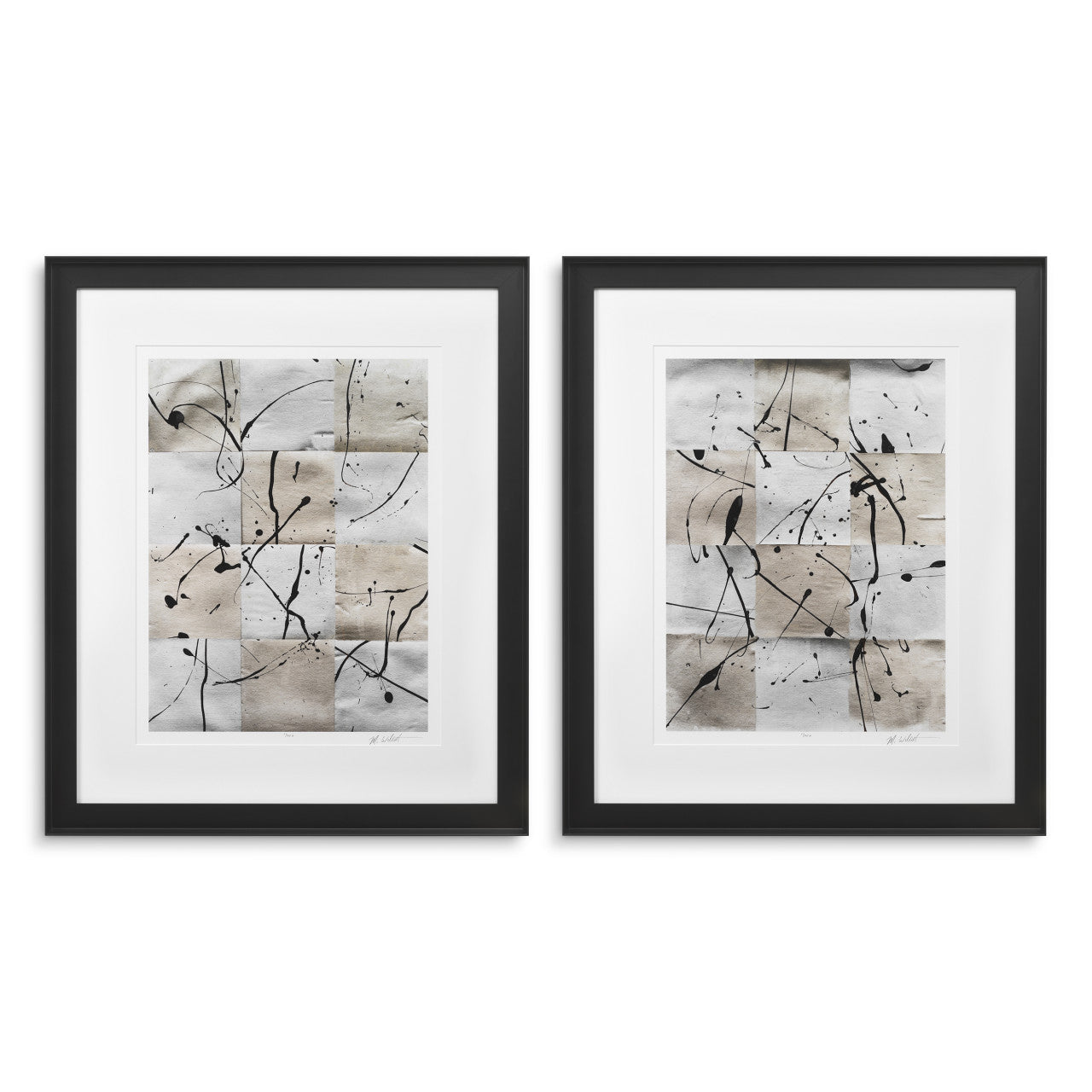 De Ink Casting prints van Michael Willett, aangeboden als set van twee, brengen een verfijnd gevoel van beweging en abstractie in je interieur. Elke compositie heeft een beige achtergrond met expressieve, inktachtige accenten, die samen een opvallend maar harmonieus visueel ritme creëren.
