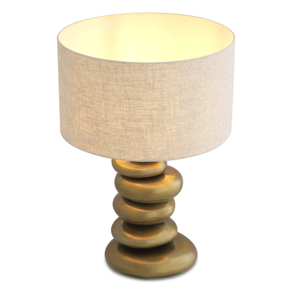 De Table Lamp Kallisto belichaamt de serene elegantie van gestapelde stenen en heeft een vintage messing afwerking die een warme, verfijnde gloed uitstraalt. Het gladde, tactiele silhouet in combinatie met een verfijnde lampenkap vormt een harmonieuze mix van natuurlijke inspiratie en tijdloze luxe.