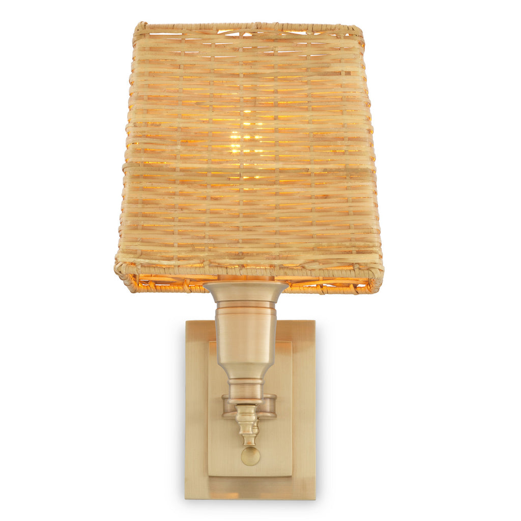 Ontdek de Wandlamp Lexington, uitgevoerd in antiek messing met een natuurlijke rotan kap die een warme, uitnodigende gloed verspreidt. De combinatie van verfijnd metaalwerk en organische textuur brengt een elegante uitstraling die zowel geraffineerd als ontspannen is.