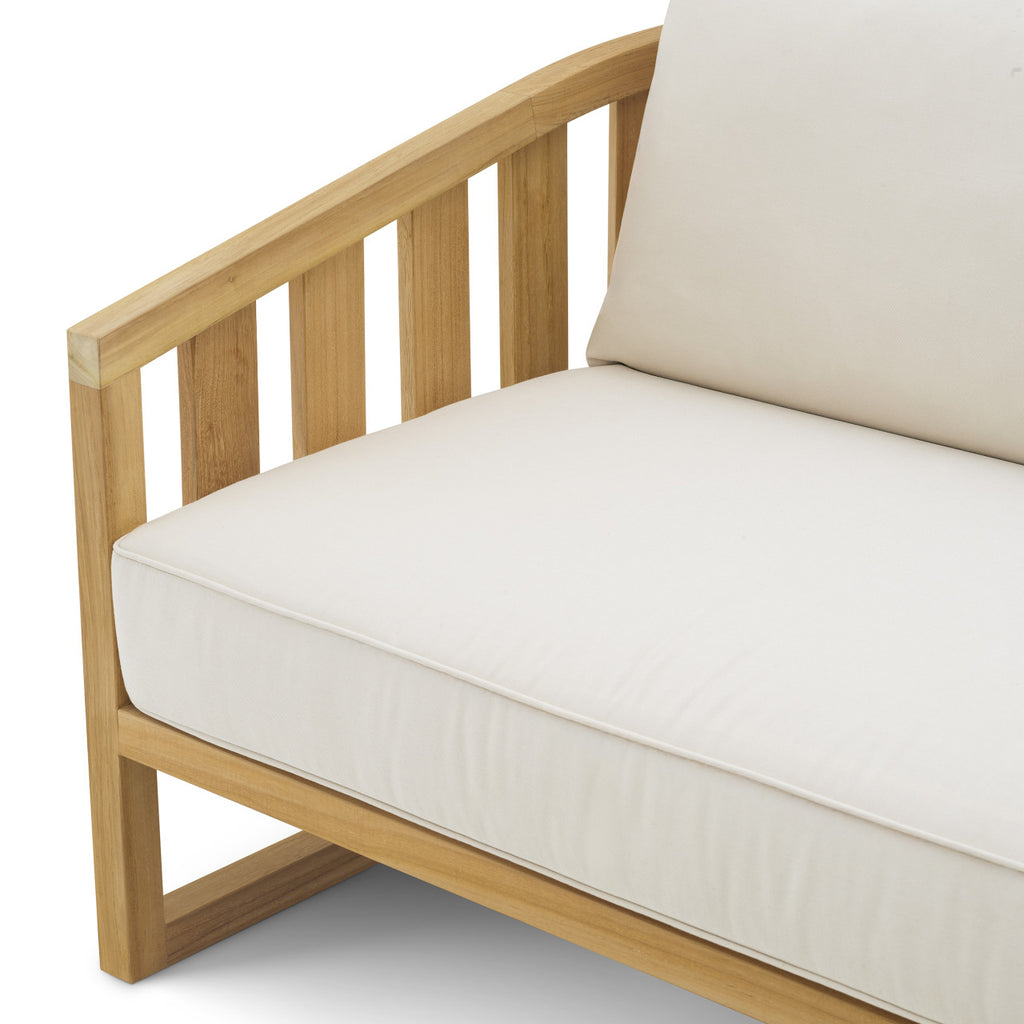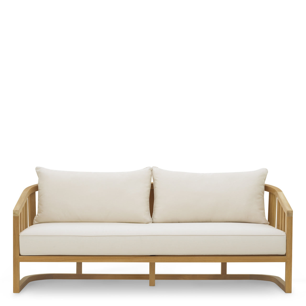 Ontdek de Outdoor Sofa Aruba, waar de warme nerven van natuurlijk teak moeiteloos samensmelten met zachte Sunbrella-stofkussens in neutrale tinten. Het zwevende ontwerp straalt een luchtige elegantie uit en combineert duurzaamheid met verfijnd comfort.,