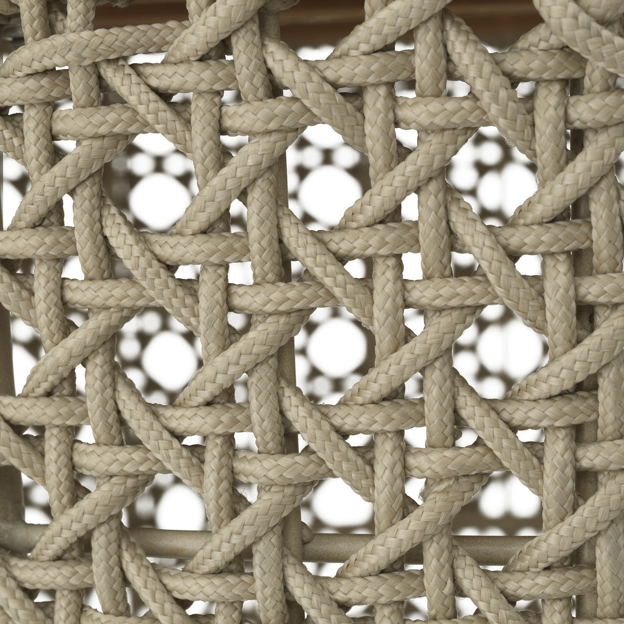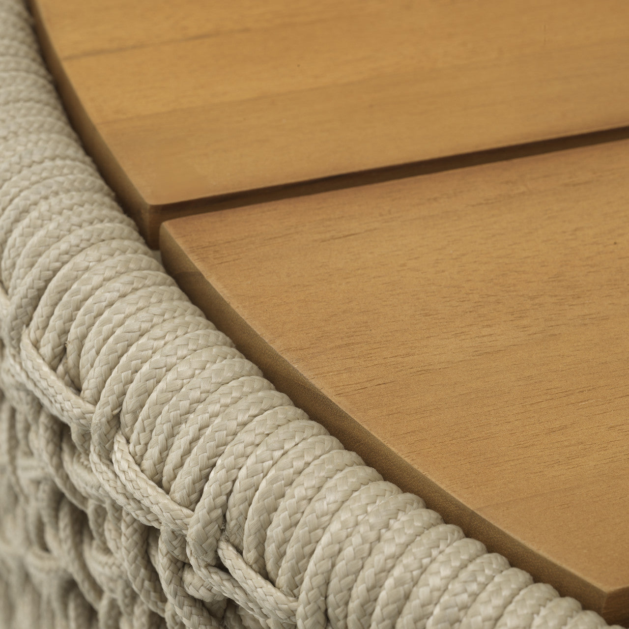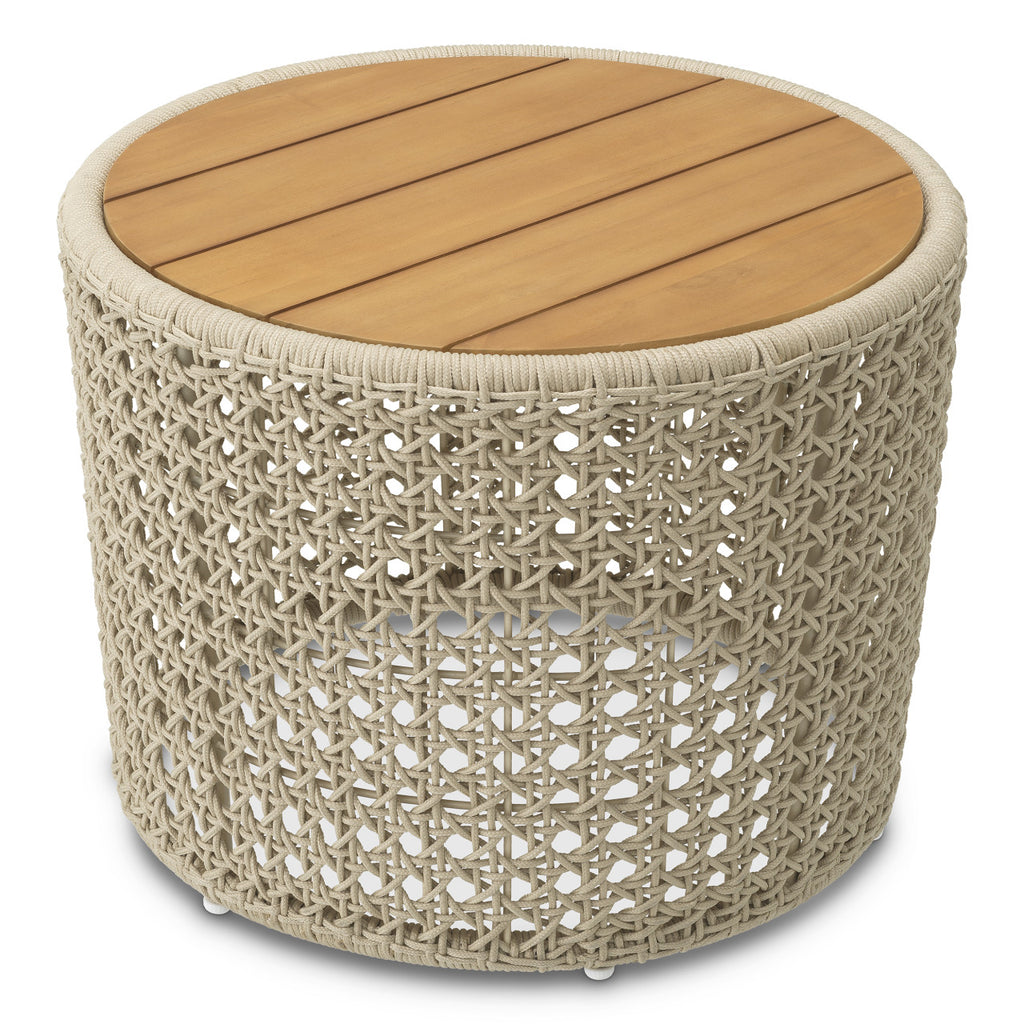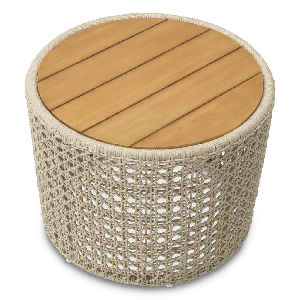 Maak kennis met de Outdoor Side Table Trinity in cream weave, geplaatst op natuurlijk teak—een harmonieuze mix van organische texturen en subtiele elegantie. Het neutrale kleurenpalet versterkt serene buitenruimtes.